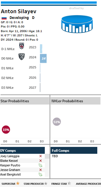 “There are a lot of defencemen at the top end of this draft that scream future 1-2D that could QB a PP1 as well. I'm not sure there are any at the top end that I would be leery of. Silayev, I suppose, is one I'd be a bit leery of being taken too early. He's enormous and has tremendous mobility for someone his size, can close gaps very quickly. Lots of enticing qualities. But, he also doesn't have a ton of offence and point production to him and is heralded as a defensive d-man. These real big guys that are taken really high, that aren't also 90th percentile producers in their draft, you don't often get great value on them, when you look back a decade later. So, passing on a smaller offensive defenceman who could be a 50-point-per-season player (and there are a number of them in this draft) for a bigger defenceman with very likely less offensive upside could turn out to be a mistake down the road. Silayev in the 15 to 20 range though has more appeal to me.”